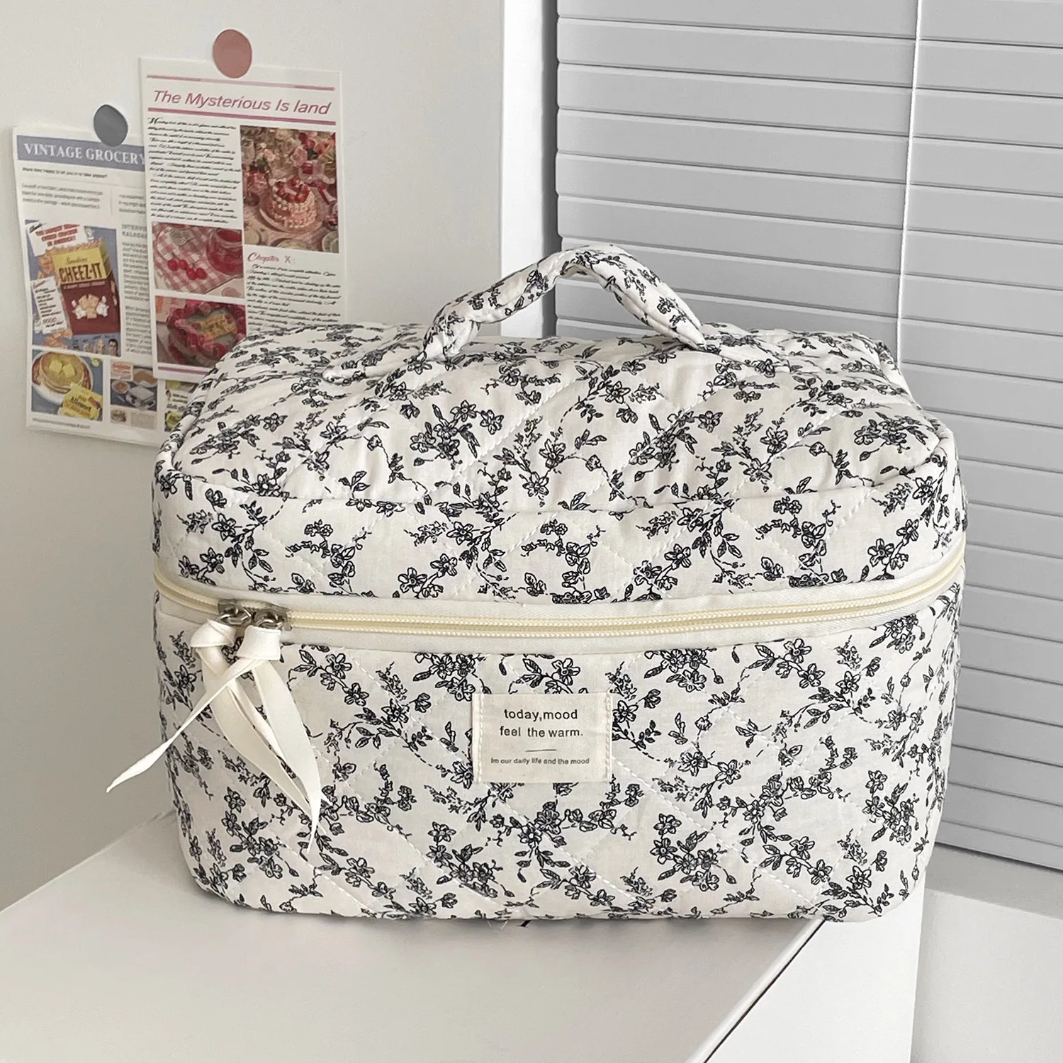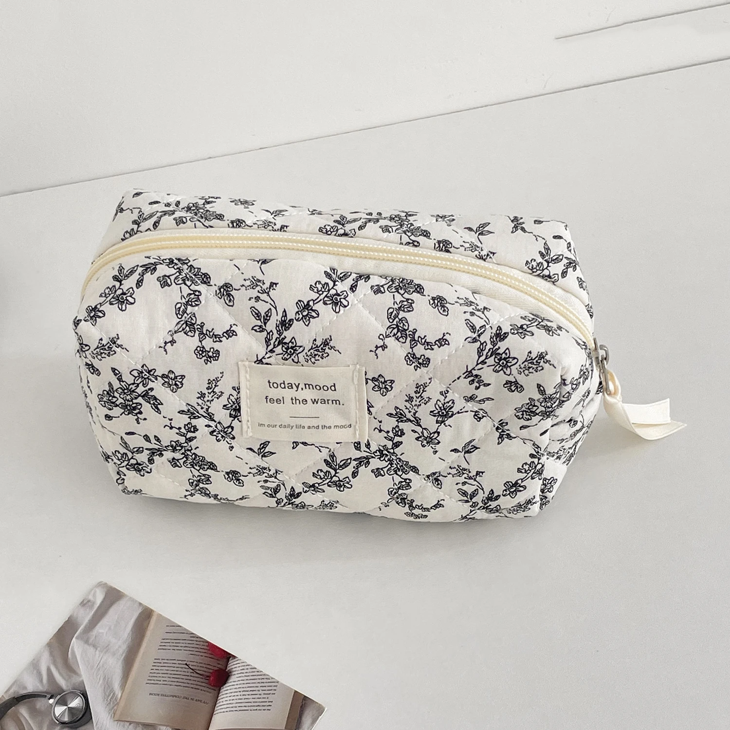 Élégante trousse de toilette matelassée au motif fleuri noir sophistiqué. Design capitonné tendance, fermeture zippée sécurisée et polyester résistant pour ranger vos essentiels beauté avec style.